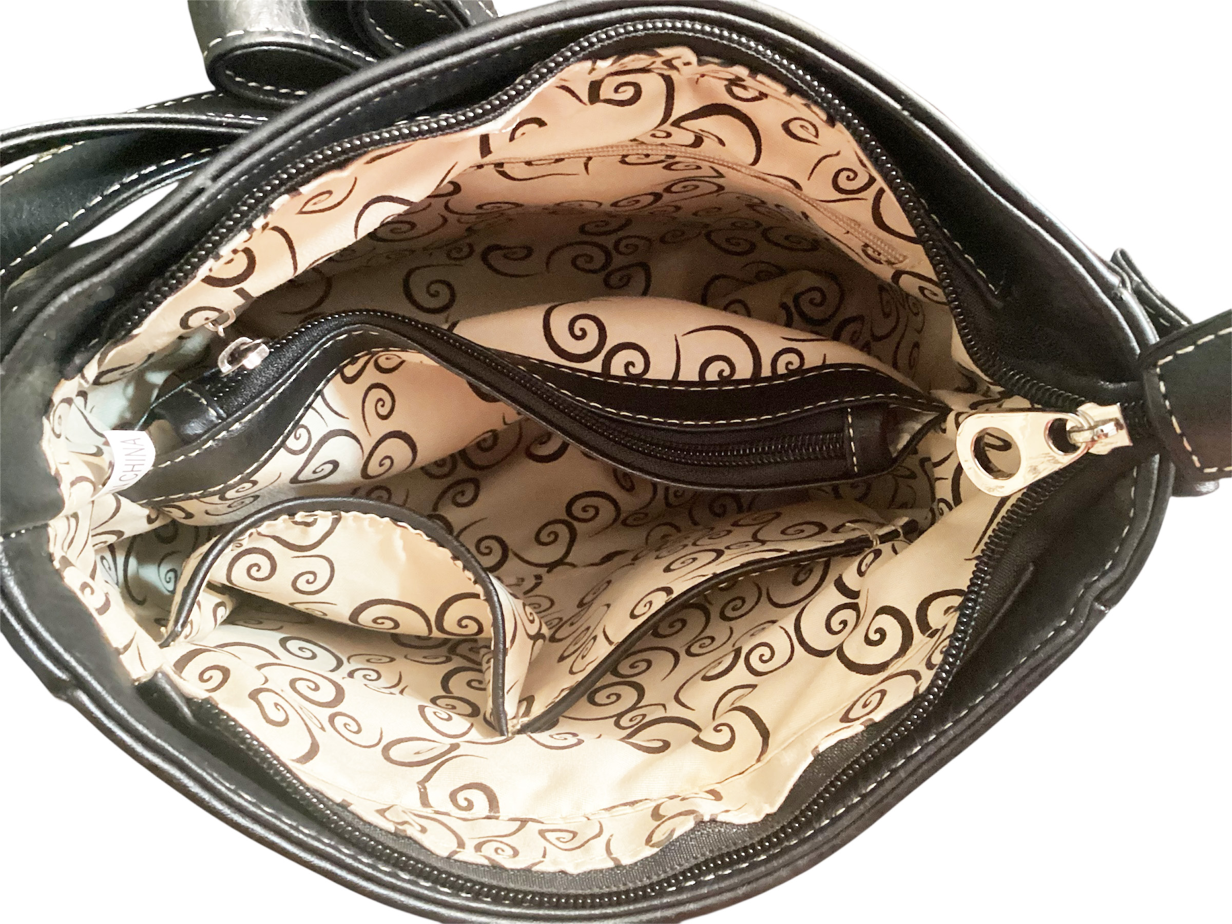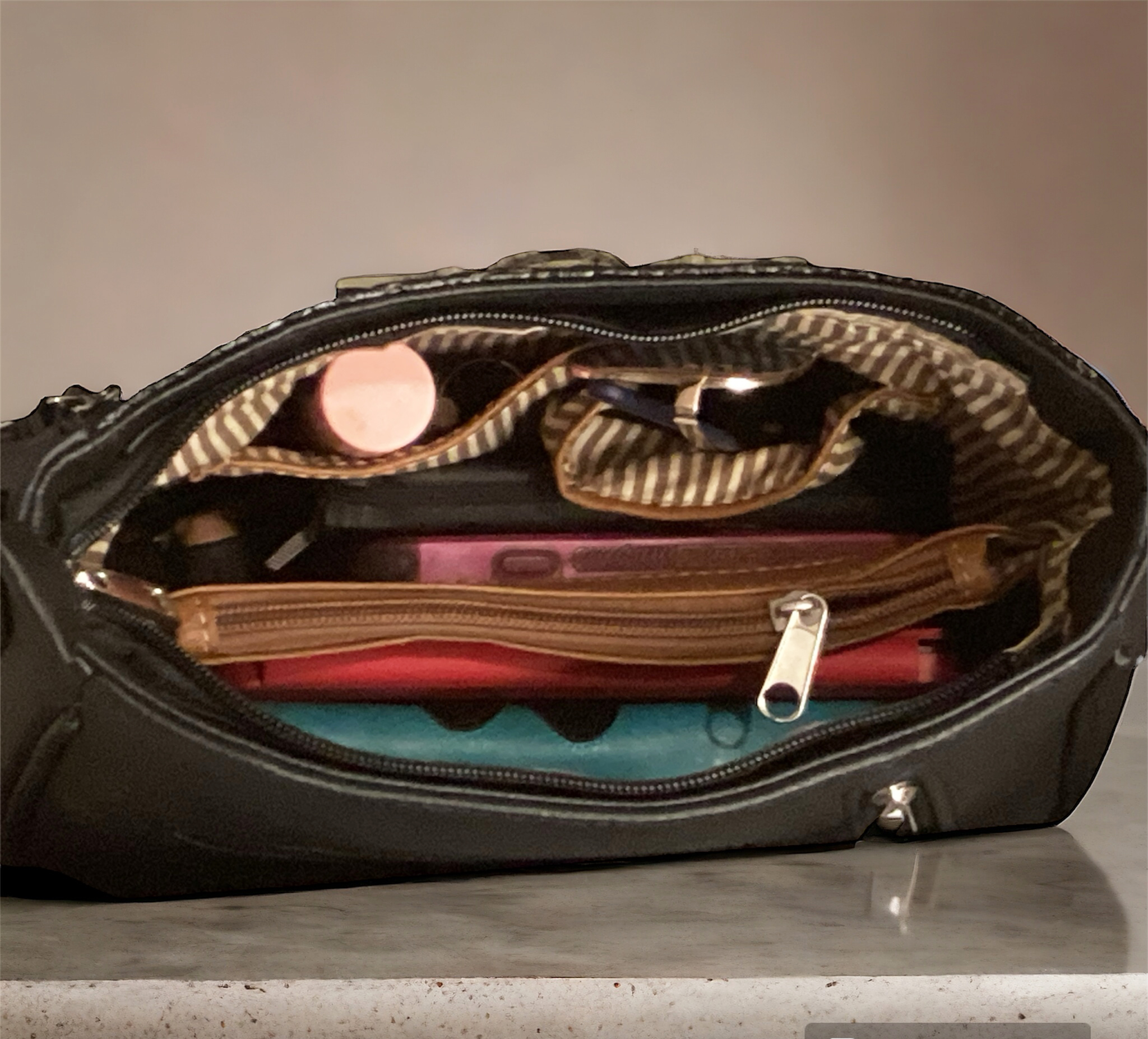- Compact interior with zippered divider, 2 open pockets and a zip wall pocket to keep items neatly arranged
